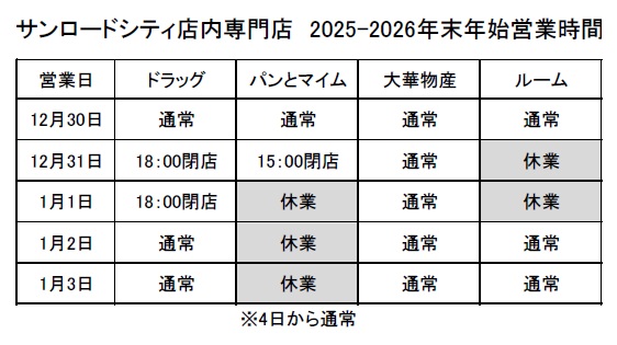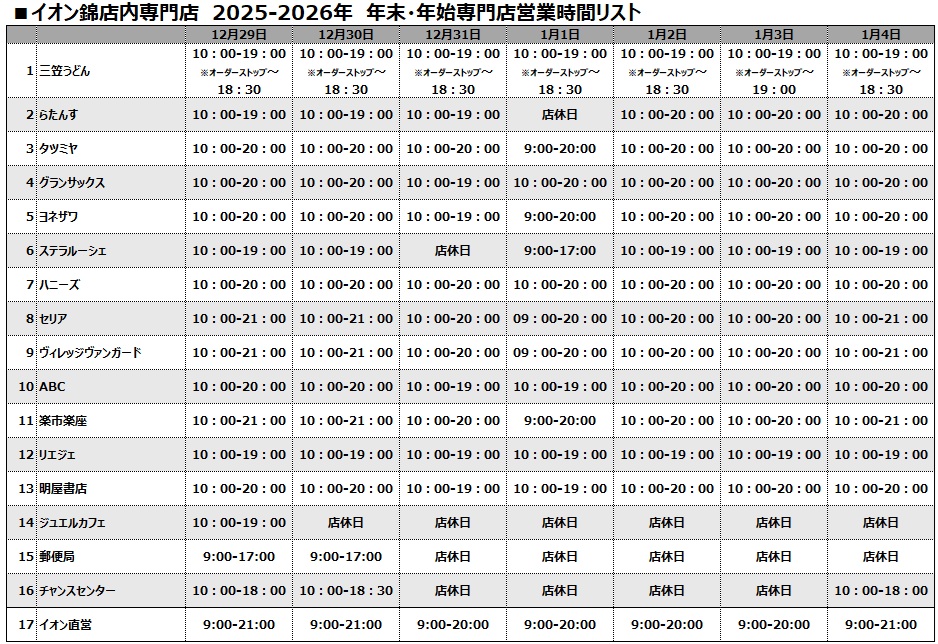 各テナントの年末年始の営業時間について(2025-2026)