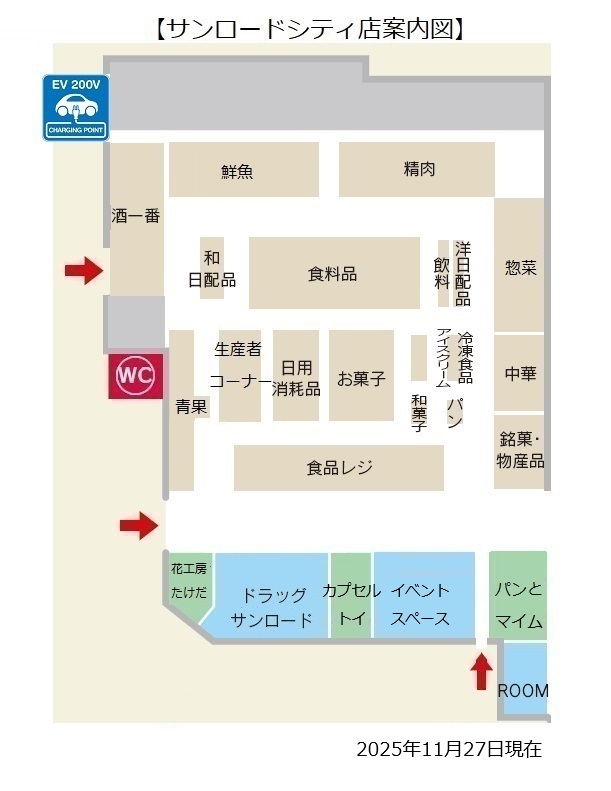 皆さまの生活に密着した明るいお店です!生鮮品をはじめ豊富な品揃えでお待ち致しております。また店内には、花工房たけだの生花やドラッグサンロード(薬・日用品)、パンとマイム(焼きたてパン)、ROOM(ルーム、衣料・雑貨)、大華物産(中華惣菜)などの専門店や、大人気のカプセルトイコーナー、酒売り場前駐車場に電気自動車の充電スポットもございます!